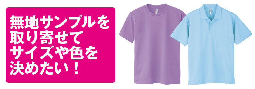 お届け日までに余裕がある場合は、無地サンプル貸出をご利用頂き、Tシャツを手に取ってサイズや色を確認して頂けます。色確認のサンプルは2色まで同送致します。※無地サンプルの用意が無いウェアもございます。