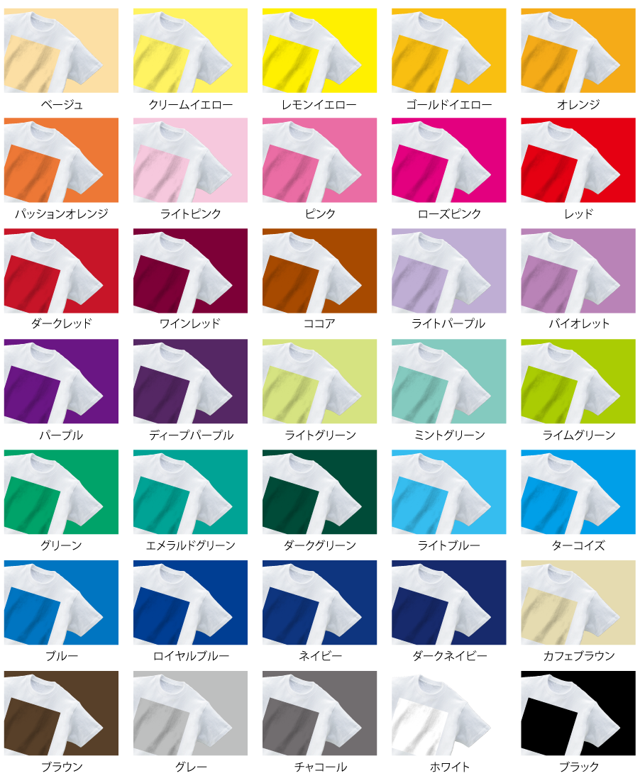 ※上記カラーは、ご利用のモニター環境により見え方が異なりますので実際の仕上がりとは差異があります。また、淡色・濃色のウェアで発色が違って見えます。