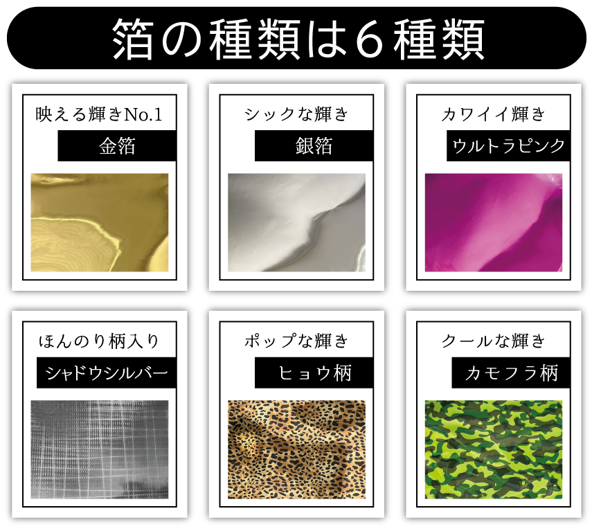 金箔・銀箔をはじめ、6種類の箔をご用意しています。キラキラ目立つクラTを作りたいクラスにおススメの加工です!