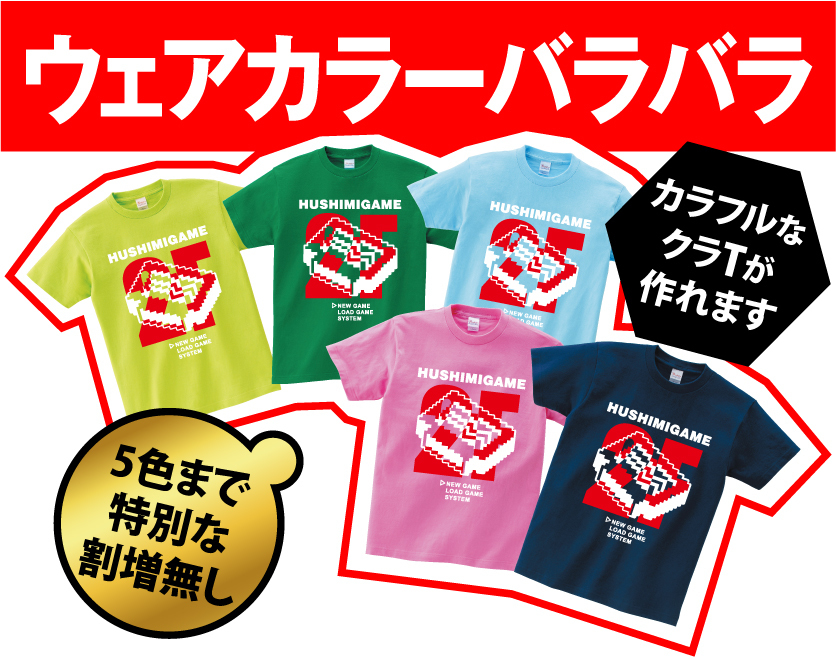 ※20枚以上のご注文で、デザインが共通ならウェアカラーが5色でも特別な割増無しで作れます。6色目以降のウェアカラーには1色追加毎に+200円(合計金額に)です。