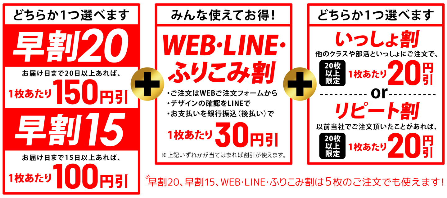 ※いっしょ割はご注文時に注文するクラス・団体名をオーダーシートまたはWEBご注文フォームに記載してください。また、一緒にご注文するクラス・部活と同じ日にご注文・打ち合わせができることが条件です。