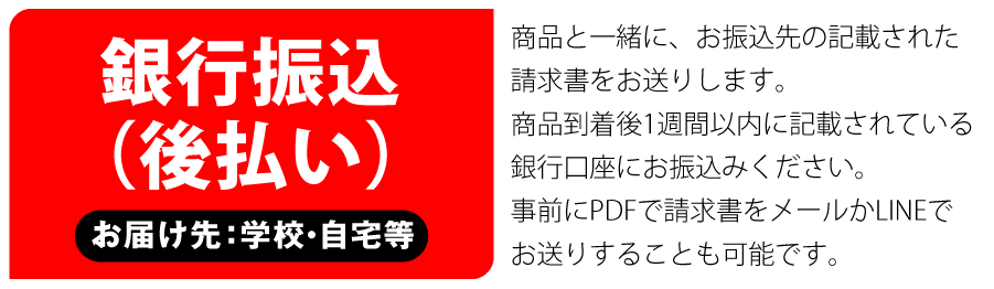 ※銀行振込は商品のお届け先が学校でもご自宅でもご利用頂けます。※振込手数料はお客様負担となります。