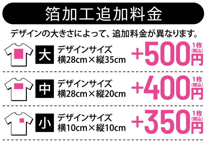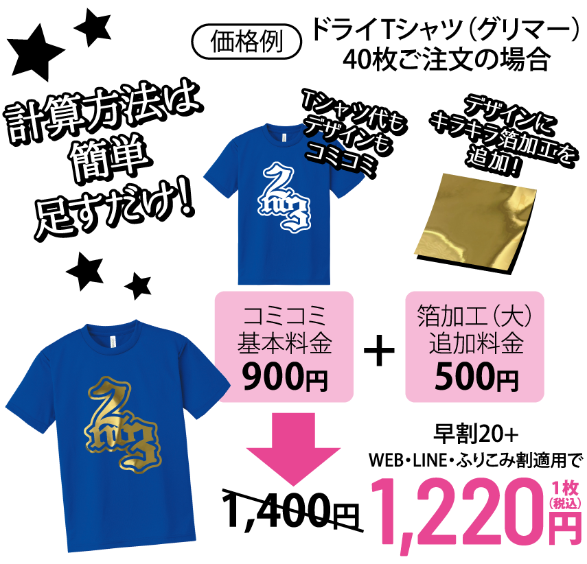 箔プリントにしたい場合も計算は簡単です。コミコミ料金に箔加工追加料金を足すだけでOK!コミコミ料金はTシャツによって異なります。各商品ページをご確認ください。