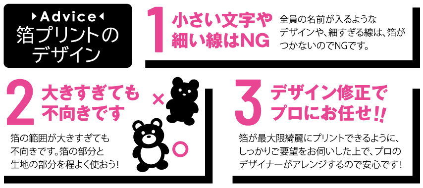 箔の性質上、箔プリントのできるデザインにはある程度の制限がございます。打ち合わせの際に、デザインを見てご希望のデザインのままで箔が使えるか、修正が必要かお伝えしますが「基本的には小さい文字や線には不向き」と考えてください。