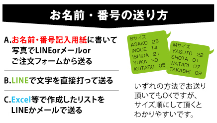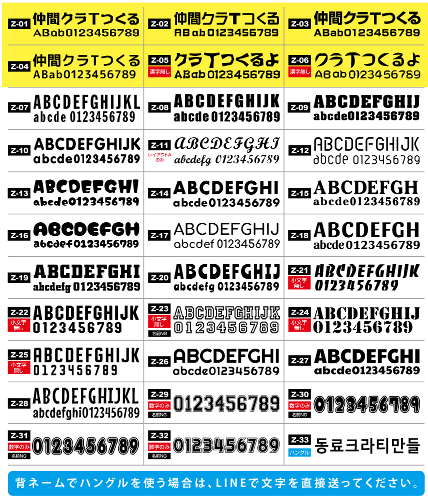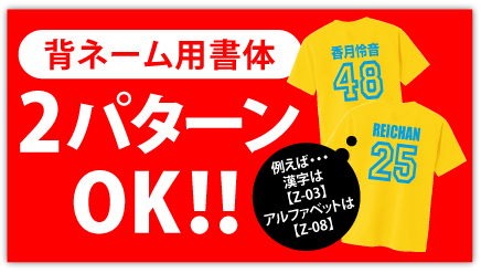 ※背ネームの書体を2パターンにする場合、1人のお名前で2書体を組み合わせて使うことはできません。また、番号は全員共通の書体を選んでください。